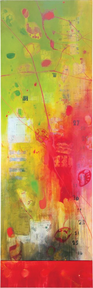 “JUL 2019 / Svetski mesec bez plastike / vodenih bojica / ponosa invalida / svesti o krvi pupčane vrpce / o streptokoki grupe B / o juvenilnom artritisu / o sarkomu / Moj mesec izložbi u Ulmu”, 215 x 70 cm, akril na platnu, 2023