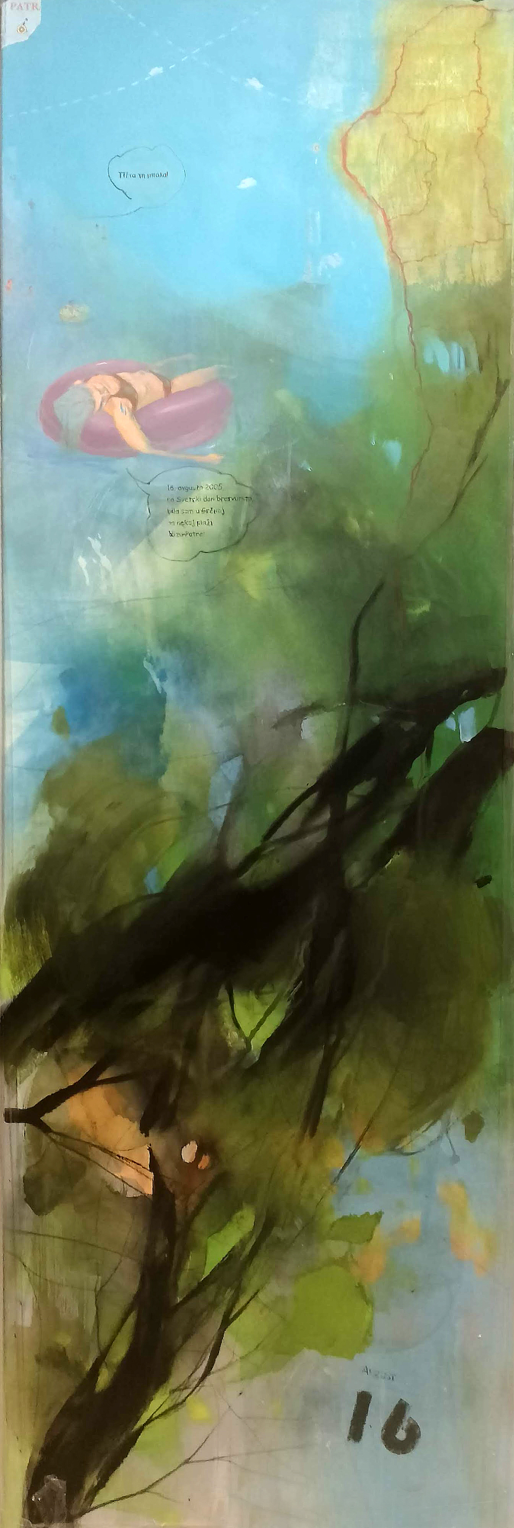 “16. AVGUST 2005 / Svetski dan bratvursta / Moj dan na plaži u Grčkoj”, 200 x 70 cm, akril na platnu, 2024